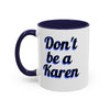 Express your sense of humor with this vibrant accent mug featuring the phrase 'Don't be a Karen'. Perfect for sipping on your favorite hot beverage while starting your day with a smile. Ideal for those who enjoy a good laugh and want to add a playful touch to their morning routine. Great for gifts on birthdays, holidays, or just to brighten someone's day.